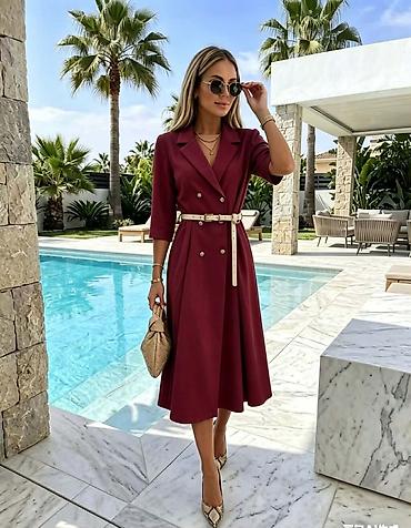 Elegantna crvena haljina do kolena sa dugim rukavima i prozirnim gornjim delom. Model je pripijenog kroja koji prati liniju tela, sa diskretnim ključ‑izrezom ispod okovratnika. Gornji deo i bokovi ...