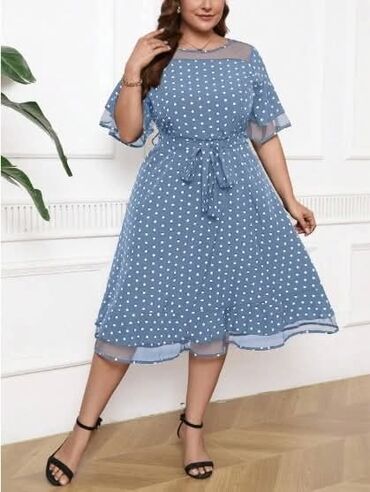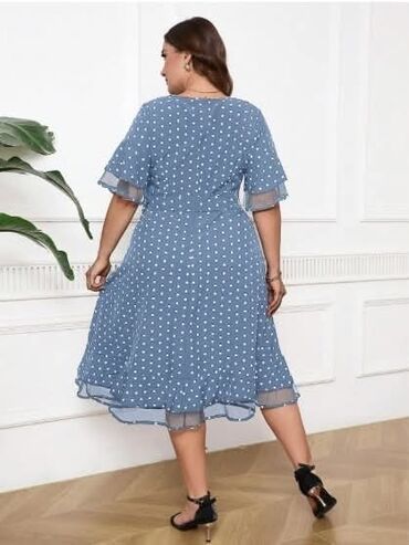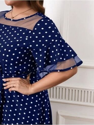 Haljina na tufne, tamnoplava sa belim kružićima. - Kroj: midi dužina, lagano zvonast donji deo - Gornji deo: drapiran/šal-izrez sa blagim naborima, bez rukava - Struk: blago naglašen, pada mekano -...