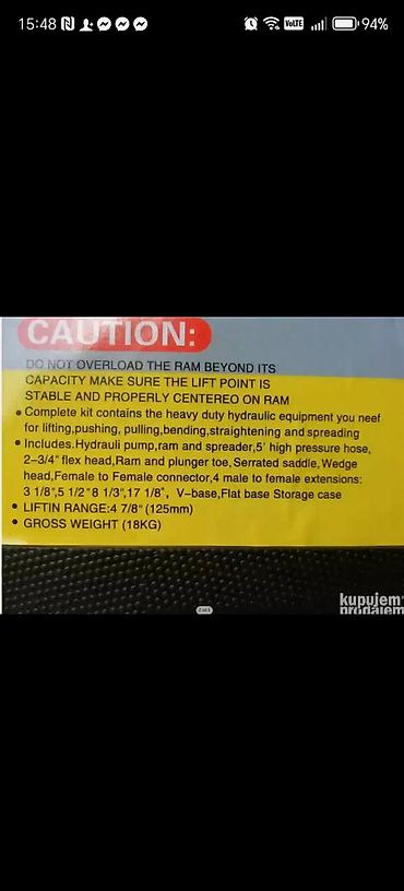 - Sadržaj kompleta: hidraulična ručna pumpa, cilindar (ram) i širitelj (spreader), fleksibilna glava 2–3/4", papuča/vrh za klip i klizač, nazubljeno sedlo, klinasta glava, spojka žensko–žensko, četiri produžetka muško–žensko (3 1/8", 5 1/2", 8 1/3", 17 1/8"), V-baza, ravna baza