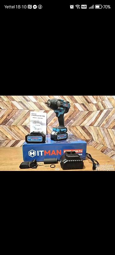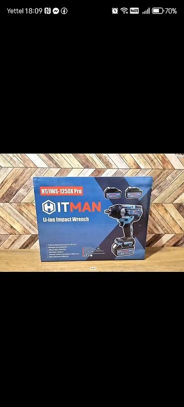 Napomena: Fotografije prikazuju originalnu HITMAN ambalažu HT/IWS‑1250X Pro i komplet sa dve baterije i punjačem, kao i rotacioni čekić-bušilicu sa bočnom ručkom i više radnih modova. Idealno za građevinske i auto servis poslove gde je potrebna mobilnost i snaga bez kabla.