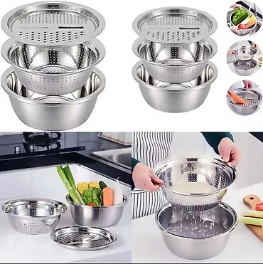 Set od inox posuda 3 u 1 – činija, cediljka i poklopac/rende -