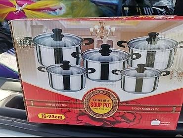 Klasičan dizajn koji se uklapa u svaku kuhinju; praktičan komplet za kompletno opremanje za kuvanje. Na kutiji je naznačeno: “Classic Soup Pot – Three Piece Suit”, “Simple Doctrine”, “Enjoy Freely Life”, raspon prečnika 16–24 cm.