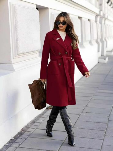 Ženski kaput – elegantan model sa pojasom - Kroj: midi dužina, ravna silueta sa kaišem za strukiranje, dvoredno kopčanje (dugmad napred), prorez pozadi za lakše kretanje - Kragna/laprle: široki re...
