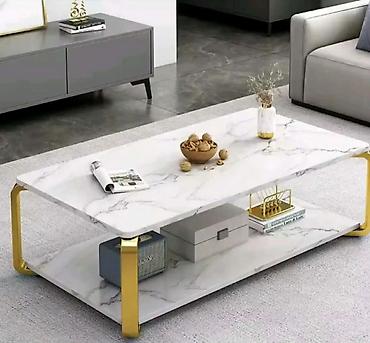 - Dizajn: pravougaoni dvoslojni sto elegantnih, zaobljenih ivica. Gornja i donja ploča u efektu belog mermera sa sivim žilama.