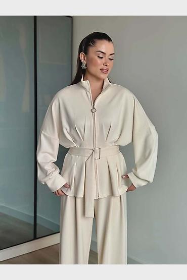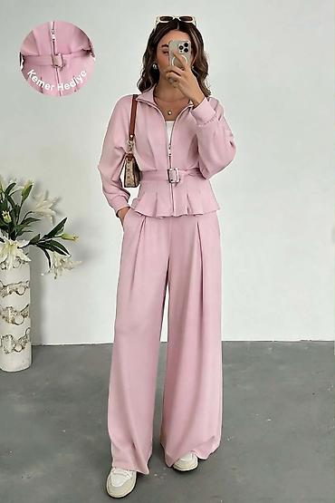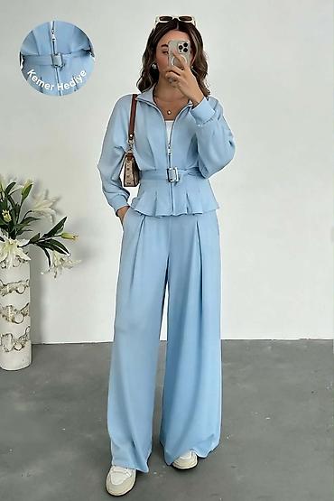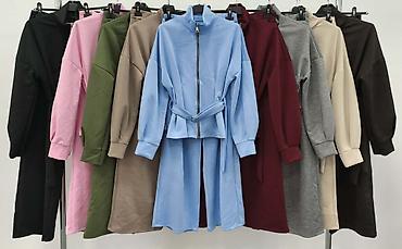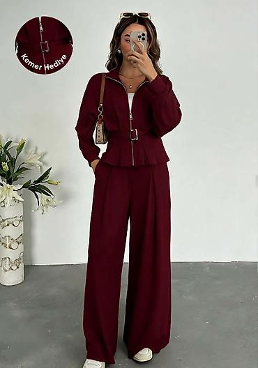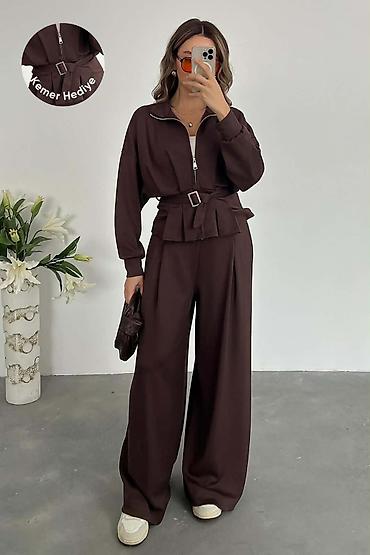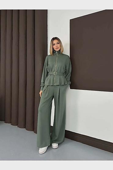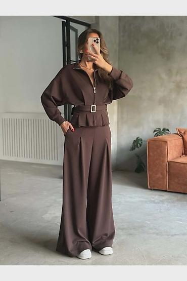 Dvodijelni ženski komplet od rebrastog pletiva - Gornji dio: dugi rukavi, okrugli izrez, opušten kroj koji prijatno pada preko tijela. - Donji dio: ravne nogavice blago šireg kroja, elastični poja...