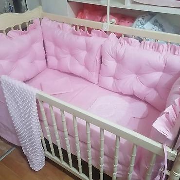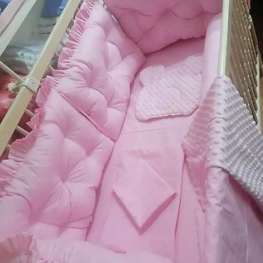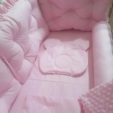 Materijali: prijatan pamuk za posteljinu i ogradice, minky pliš za dekorativni jastučić i ćebe. Dizajn u nežno roze boji, idealan za krevetac standardnih dimenzija. Mekana zaštita ivica, udobna podloga i toplo ćebe za miran san bebe.