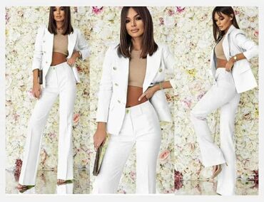 Damski komplet – sako i pantalone u bež/ekru nijansi. Detalji: - Sako bez kragne, zakopčavanje na 5 dekorativnih metalnih dugmadi - Dugi rukavi sa sitnim dugmadima na manžetnama - Kroj blago struk...3 000 RSD