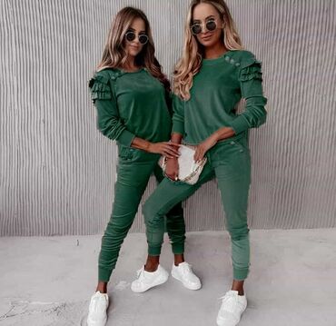 Pleten komplet (džemper i pantalone) u svetloplavoj nijansi. - Gornji deo: rolka sa širokim rebrastim ovratnikom, opušten kroj, blago talasasti porub. Rukavi ukrašeni nizom dekorativnih dugmadi u ...3 000 RSD