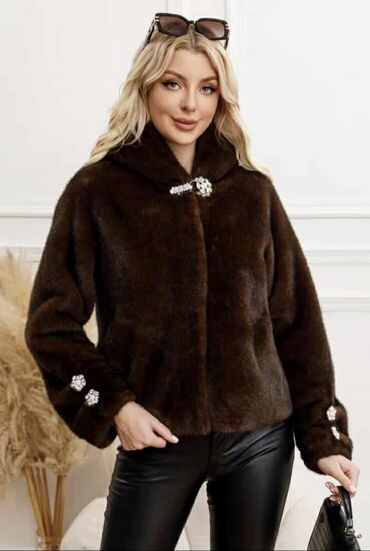 Crna ženska jakna od veštačkog krzna sa kapuljačom. Detalji: - Materijal: mekano, gusto veštačko krzno sa sjajnim finišem - Boja: duboka crna - Kroj: kraća dužina, blago boxy silueta - Zatvaranje:...