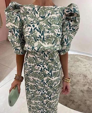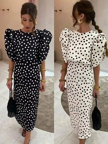 - Kroj: midi dužina, blago strukirana silueta; okrugli izrez; izraženi puf rukavi do lakta sa naborima.