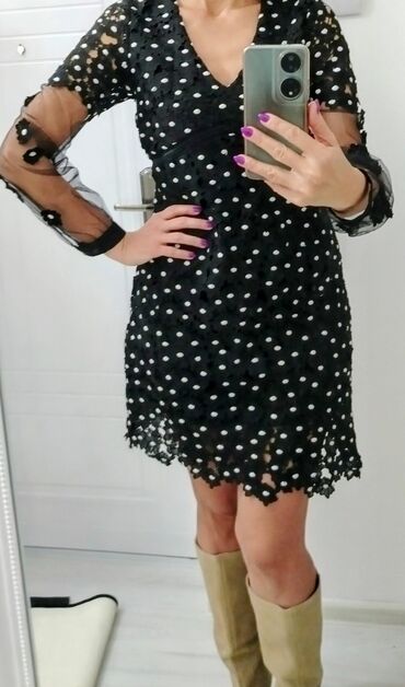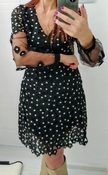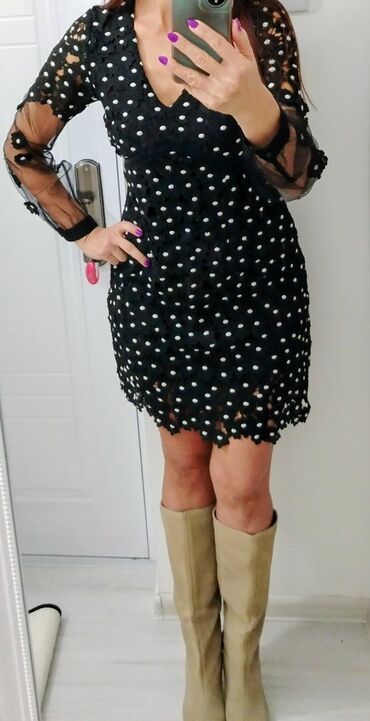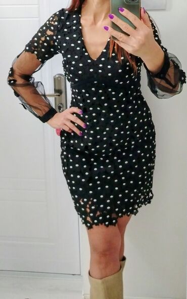 Moderna, prelepa haljina sa čipkom na rukavima, sva je od cvetića, vel M, ima postavu, a ima i elastina. Zakopčava se sa strane, fantastično stoji.