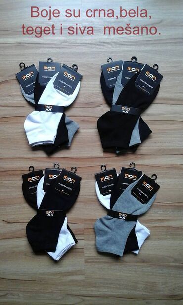 Paket 12pari u jednoj boji je 1300din. 85%Cotton,10%Polyamide,5%Elasthane.