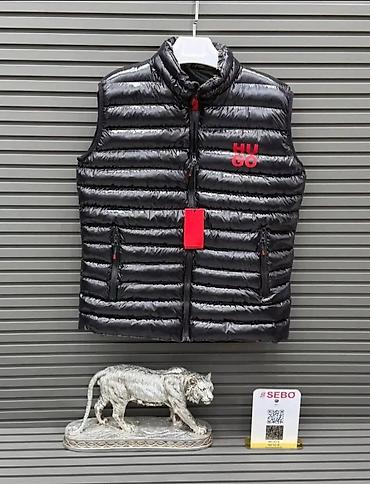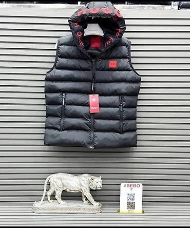 Muški štepani prsluk u crnoj boji, sa kapuljačom. Prsluk ima horizontalne proštepe i zatvaranje rajsferšlusom celom dužinom. Sa strane su dva džepa sa rajsferšlusom. Kapuljača je ukrašena natpisom u kontrastnoj boji. Ovaj prsluk je pogodan za prelazne periode i pruža dodatnu toplinu.