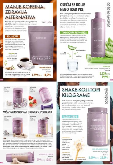 - Svakodnevna superhrana (protein/obrok u prahu): više ukusa (vanila 520 g – šifra 1000749; jagoda 520 g – šifra 1000750; čokolada 540 g – šifra 1000751; banana 520 g – šifra 1000810). Obogaćeno proteinima i vlaknima (prebioticima). Napomena o pripremi: 4 pune kašike (52 g) sa 200 ml mleka ili vode.