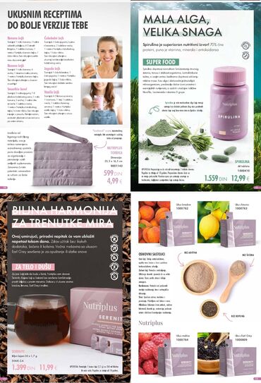 - Spirulina tablete: superhrana – 70% proteina, vitaminsko-mineralni profil i antioksidansi. Pakovanje: 60 tableta. Šifra: 1000410. Cena prikazana: 1.559 RSD / 12,99 €.