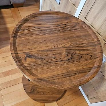 - Dizajn: dve okrugle ploče u teksturi oraha; gornja ploča sa blagim uvučenim rubom (ivica sprječava klizanje predmeta).