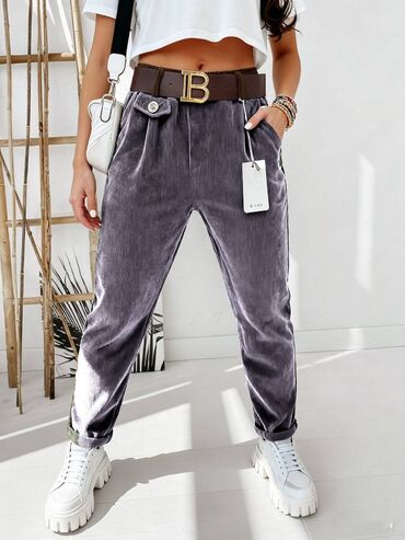 Tamnosive ženske pantalone od mekane, rastegljive trikotaže. Visoki struk sa širokom elastičnom gumom obezbeđuje udobno prijanjanje i dodatnu fleksibilnost. Kroj je opušten u predelu kukova sa blag...