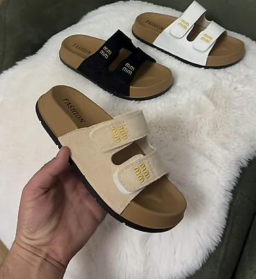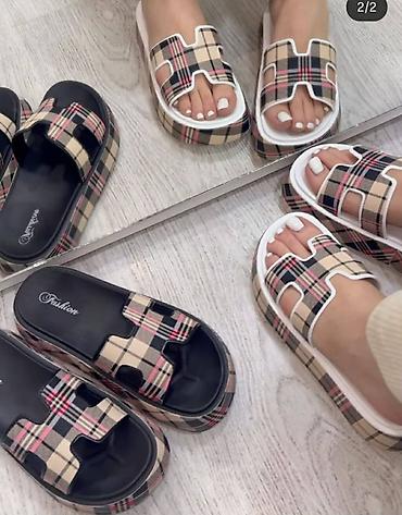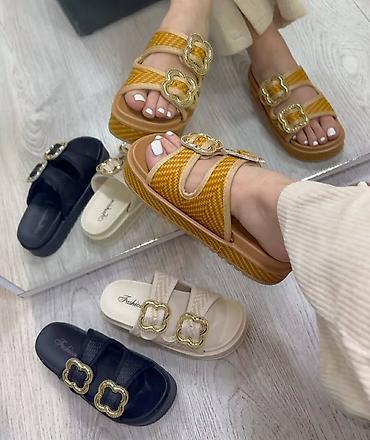 Ženske letnje papuče i sandale – više modela - Brojevi: 36–41 (naznačeno na fotografijama) - Modeli: 1) Ravne papuče sa kvadratnim vrhom i širokim gornjištem ukrašenim metalnim slovom V. Više bo...