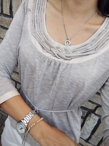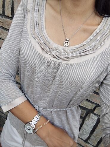 Bluzica: 2500din Elegantna ženska bluza sa dugim rukavima i zvonastim manžetnama. Model ima kvadratni/dekolte u obliku srca sa blagim naborima i ukrasnom kopčom u sredini, blago strukiran kroj koj...