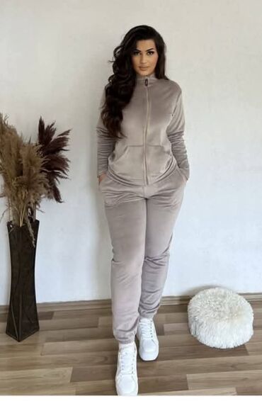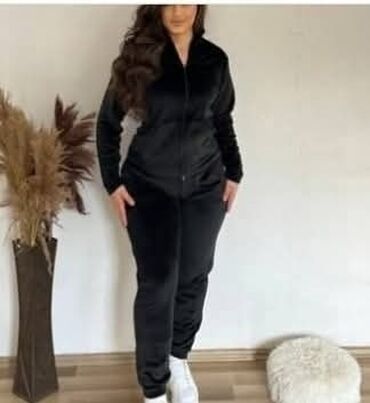 Elegantna ženska trenerka – crna - Dvodelni komplet: sako i pantalone - Brend: Merimars (etiketa vidljiva) - Materijal: mekana pletena tkanina sa detaljima od eko-kože (satenski/sjajni finiš) - Bo...