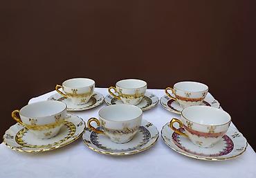 - Dekor: bogat zlatni floralni ornament i kružni friz; pojedine šoljice/tacne sa ružičastim, plavim ili zelenim ukrasnim pojasom
