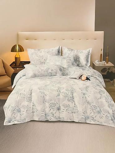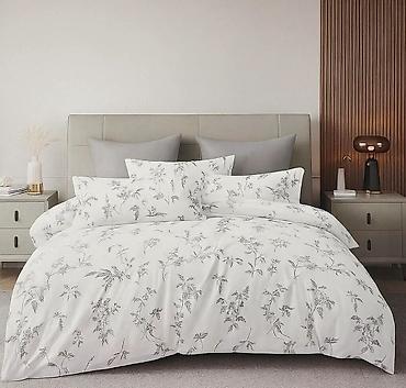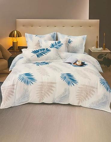 - Elegantni set posteljine sa modernim dezenima: botanički motivi u plavim i bež tonovima, sivi floralni crteži, suptilni listovi u pastelnim nijansama i apstraktni mermer efekat u zeleno‑sivim tonovima.