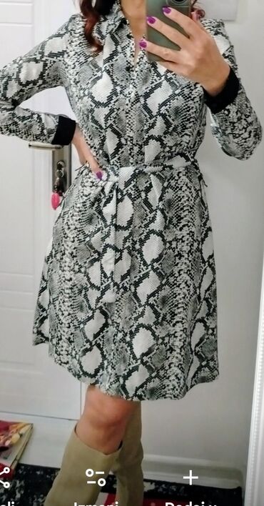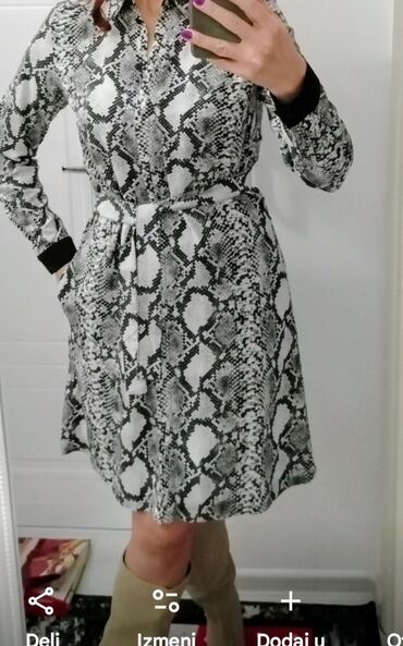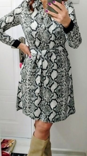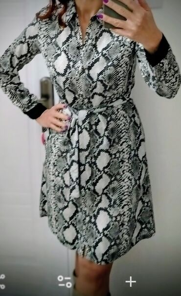 Prelepa haljina u zmijskom print u, dugih rukava, napred se zakopčava, a u struku vezuje. Vel M, perfektno stanje. Lagana i jako prijatna.