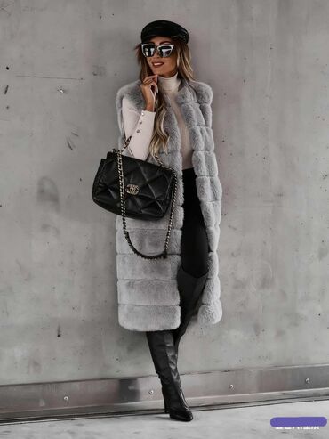 Siva ženska bunda/prsluk od krzna sa kapuljačom. - Model: bez rukava, dužina do iznad kolena. - Dizajn: izražen “puffer” izgled sa širokim, poprečnim panelima od krzna koji daju pun, voluminozan e...4 000 RSD
