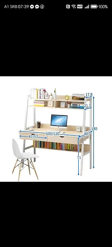 - Dimenzije prikazane na fotografiji: ukupna visina oko 140 cm; visina radne ploče oko 71 cm; dubina radne ploče oko 48 cm; širina radne površine 100 ili 120 cm (varijanta prema skici); širine segmenta fioke/police 47/57 cm; visine polica u nadgradnji približno 17,8 cm i 21,7 cm.