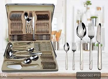 - Sastav seta: veliki nož za sto, viljuška, velika kašika, mala kašika (desertna/čajna) i dodatni kompleti istih komada za više osoba, uredno zapakovani u zaštitnim kesicama.