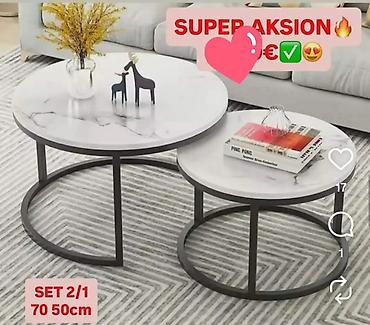 Set od dva okrugla klub stola sa pločom u imitaciji mermera. Stolovi su različitih dimenzija, dizajnirani tako da se veći i manji sto mogu postaviti zajedno, štedeći prostor. Veći sto ima prečnik 70 cm, dok manji ima prečnik 50 cm. Konstrukcija je izrađena od metala, dostupna u crnoj ili zlatnoj boji. Ovi stolovi su praktično rešenje za dnevni boravak ili prostor za sedenje, pružajući modernu estetiku i funkcionalnost za odlaganje pića, knjiga ili dekorativnih predmeta.