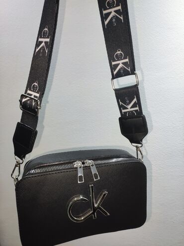 - CK crossbody torba (2 boje): kompaktna pravougaona forma sa teksturom, veliki metalni “ck” logo napred, dupli gornji rajsferšlus. Širok, udoban, podesivi kaiš sa brendom, pričvršćivanje karabinjerima. Dostupna u crnoj i svetloj (bejž/bela) varijanti.