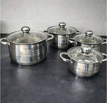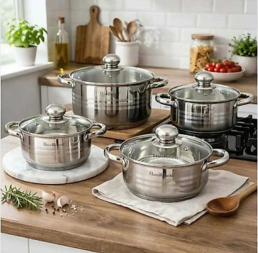 Sadrži 4 lonca različitih zapremina (idealni za supe, gulaše, testeninu, povrće, priloge), svaki sa svojim staklenim poklopcem. Moderna, elegantna izrada sa dekorativnim kružnim prstenovima na spoljašnjosti, brend oznaka HausRoland na telu. Odlično rešenje za svakodnevno kuvanje i kompletiranje kuhinje.