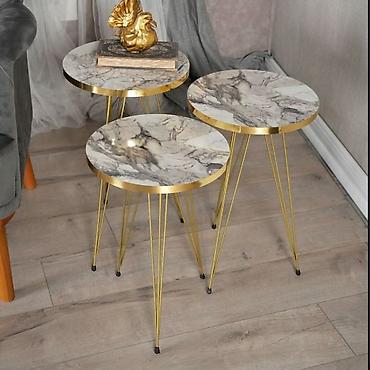 Dimenzije: tri komada u stepovanom nizu (manji, srednji, veći). Materijali: metalna konstrukcija, gornje ploče sa mermernim/sjajnim finišom. Boje: siva mermerna, crna mermerna, bela sjaj sa zlatnim detaljima.