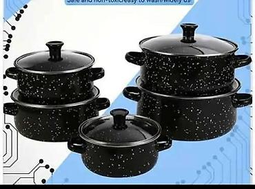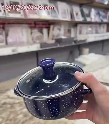 - Materijal: emajlirani čelik sa tačkastim dezenom; stakleni poklopci sa ručkama