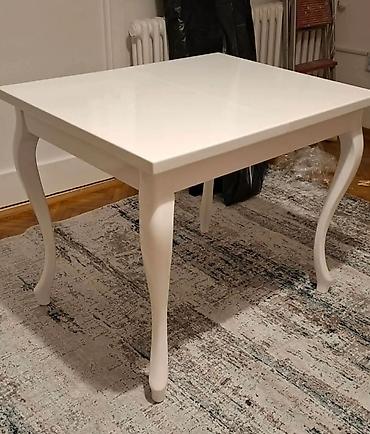 - Sto kvadratnog oblika sa visokosjajnom belom pločom i elegantnim, profilisanim nogama u klasicističkom stilu.