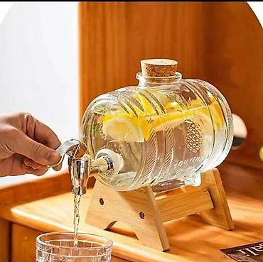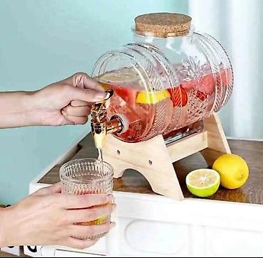 Stakleni dispenzer za piće u obliku bačvice sa postoljem