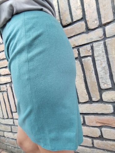 Suknja – duboki struk, veličina M. Boja: senf/oker. Kroj mini olovka sa blagim naborima sprijeda. Visoki struk sa širokim pojasom i dugim kaišem za vezivanje (mašna), kao i dodatnim provlakama. Kop...