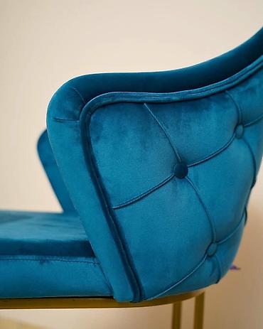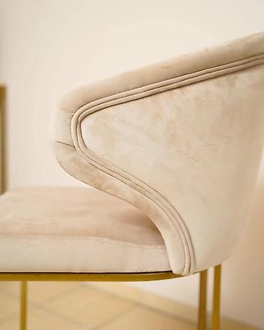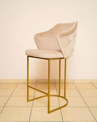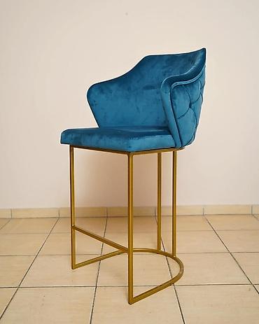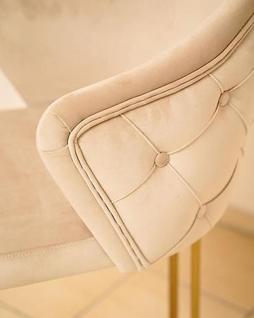 Rio Barska stolica sa naslonom – tapacirana štofom/velurom, sa dekorativnim dugmićima i elegantnim štepovima. Sedište i nasloni obloženi mekanom penom za udobno sedenje, boje: svetlo bež i tirkizna (prikazani primeri). Naslon je oblikovan sa blagim osloncem za ruke i ukrasnim kvadratnim prošivom.