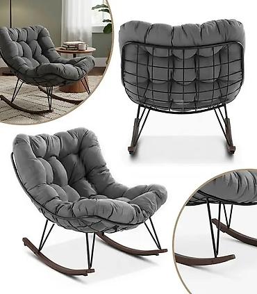 - Dizajn: moderna njihalica sa dubokim, udobnim sedištem i naslonom u obliku školjke. Tufovana, debela postava pruža potporu celim leđima i bokovima.