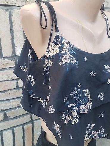Letnji top na vezivanje oko vrata (halter) - Model: kratki halter top sa dubokim V izrezom - Dizajn: crna podloga sa crvenim cvetnim printom i diskretnim zlatkastim listovima - Kopčanje/vezivanje:...