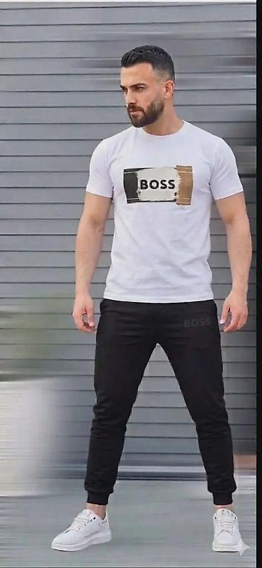 - Dizajn: veliki “BOSS” print na grudima (pravougaoni brush-stroke motiv u crnoj, beloj i bronzanoj nijansi); “BOSS” natpis i na levoj strani nogavice.