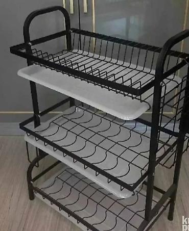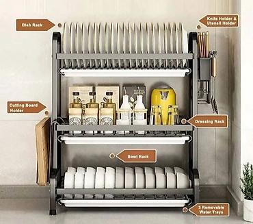 U paketu: metalni ram sa tri police, tri uklonjive tacne za kapanje i bočni držači (noževi/pribor, daska).