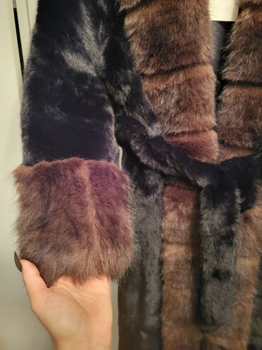 Veštačko krznoLuksuzni kaput od krzna sa efektom blok boja. Dizajn kombinije tamnosmeđe i crne tonove u širokim horizontalnim panelima, sa bujnim, punim rukavima i naglašenim bogatim manžetnama. Krzno je gusto, mekano na dodir i sa visokim sjajem, pruža odličnu toplotu i profinjen izgled. Kroj je klasičan, dužine ispod kukova prema fotografiji, sa ravnom siluetom i diskretnim preklopom sprijeda. Idealan za elegantne kombinacije i večernje izlaske, ali i kao statement komad u svakodnevnom stajlingu. Neutralne nijanse lako se uklapaju uz crnu, smeđu i zemljane palete. Savršen izbor za hladne dane uz maksimalnu udobnost i sofisticiran stil.