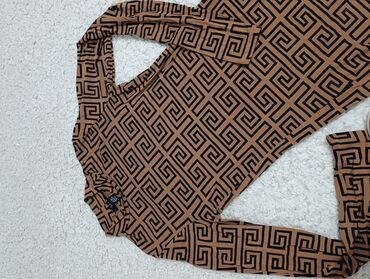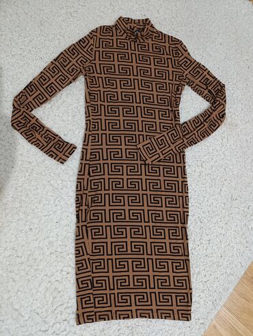 TurskaHaljina Amisu, veličina EU 34 (US/CA 4, CN 160/80), proizvedena u Turskoj. Model uski, dužine ispod kolena, sa dugim rukavima i rol-kragnom. Materijal je elastičan i prijatan, kroj prati liniju tela. Dizajn u kamel braon boji sa crnim geometrijskim/grčkim meandrom preko cele površine. Idealna za večernje i dnevne kombinacije, lako se kombinuje sa čizmama ili štiklama.