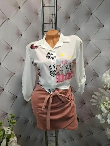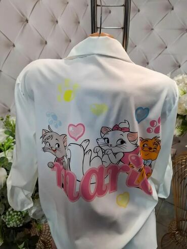 - Model 2: Bela košulja sa igrivim ilustracijama mačića i srca u nežnim pastelnim bojama. Motivi su na prednjem i zadnjem delu, sa većim printom na leđima. Klasična kragna, dugmad po sredini, dugi rukavi sa manžetnama. Feminina i razigrana, idealna za svakodnevne kombinacije.