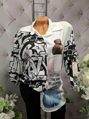 - Model 1: Bela košulja sa crno‑belim grafiti printom na rukavima i jednoj polovini prednjeg dela. Na drugoj polovini i na leđima veliki ilustrativni motiv devojke u dukserici i farmerkama sa natpisom “SELF LOVE IS THE NEW RELATIONSHIP STATUS”. Klasična kragna, dugmad po sredini, dugi rukavi sa manžetnama. Opušten kroj koji lepo pada i lako se kombinuje uz farmerke, pantalone ili suknju.