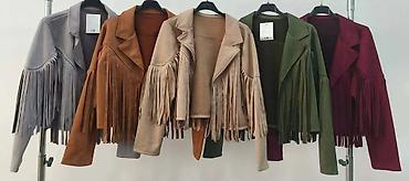 - Model: kratka biker/boho jakna sa dubokim reverima i dugim resama duž rukava i preko leđa i grudi