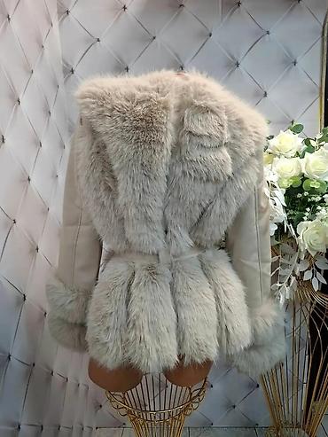 - Materijal tela u glatkoj bež nijansi, rukavi sa krznenim manžetnama