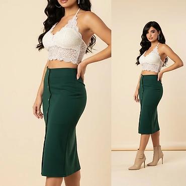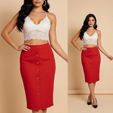 - Kroj: uska pencil/midi dužina do ispod kolena, visoki struk, blago elastična